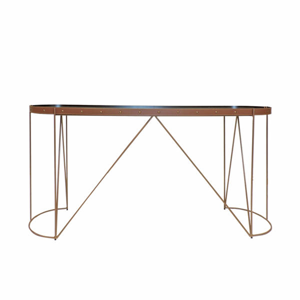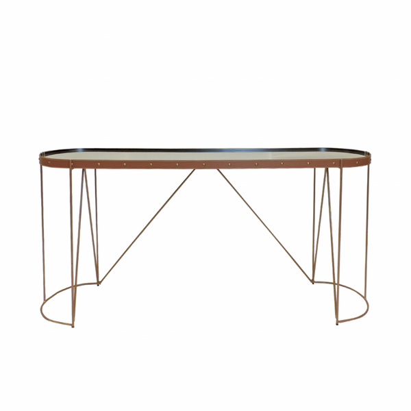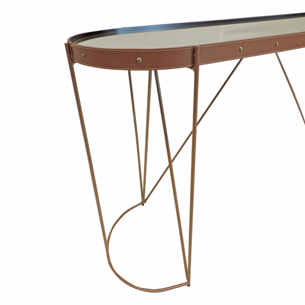 Tampo de espelho, cinta de couro com costura pesponto, pés e base lateral em metal com pintura dourada.